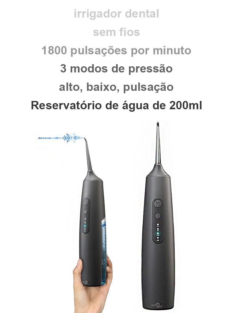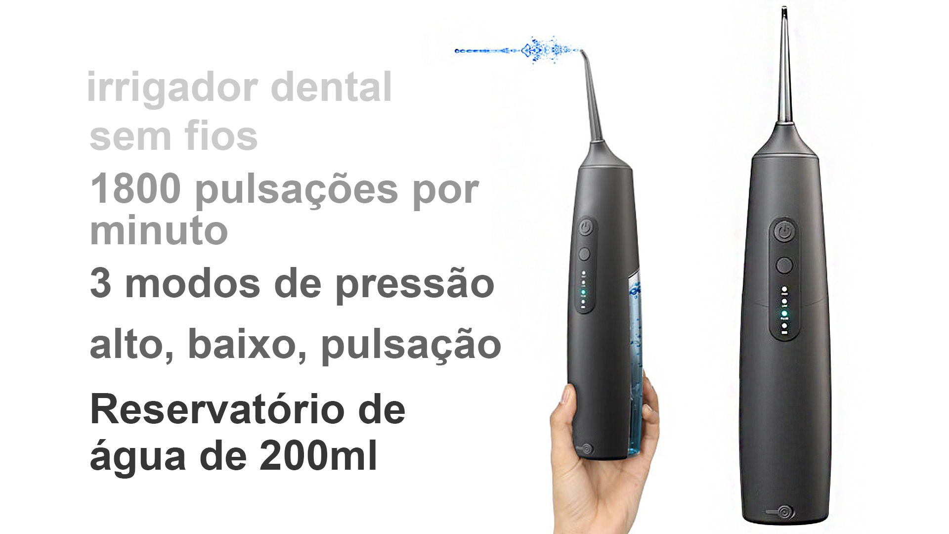 O Mais Recente Irrigador Dental Sem Fios da Cortelec oferece uma combinação única de pressão de água com 3 modos de utilização (Alto, Baixo e Pulsação) para uma melhor ação de limpeza dos dentes e uma utilização mais eficaz do que o fio dental. A pressão da água massaja as gengivas para evitar hemorragias e limpa em profundidade o tártaro dentário e os restos de comida, o que não é possível com o fio dental tradicional.